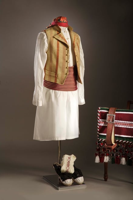 Conjunto de saragüell con calzón liso en color blanco roto, chaleco recto en tejido de tapicería y camisa Gemelos.